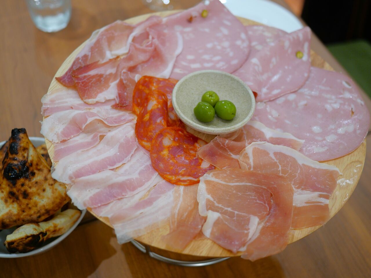 まずは名物の、生ハムとサラミの盛り合わせと焼き立てフォカッチャ