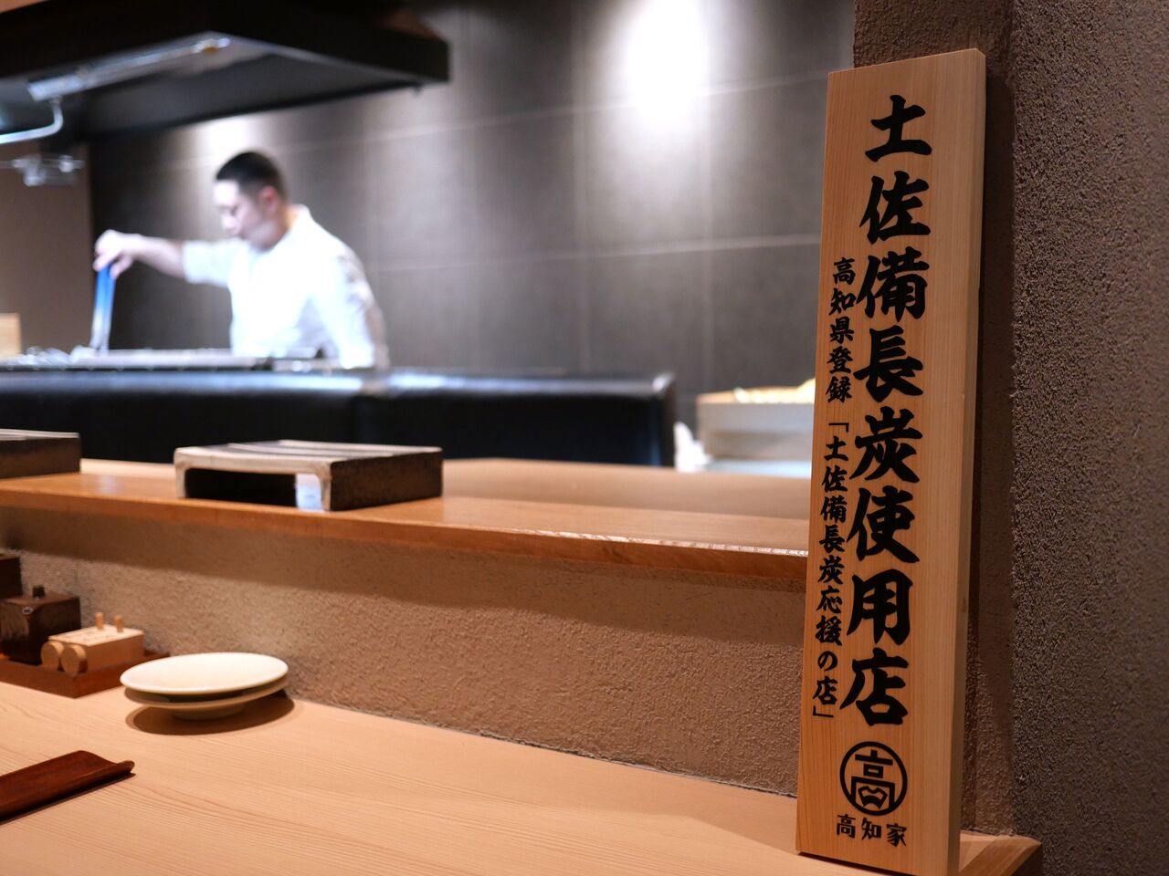 入ってすぐのカウンターの片隅に、使用している炭の看板を発見
