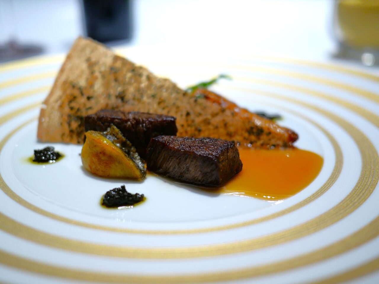 ソースが2種類かかっていて、牛肉と昆布の出汁と鮑の蒸し汁を煮詰めたものにマルサラワイン、そしてもう一つは、鮑の肝に焦がしバターを加えたソース