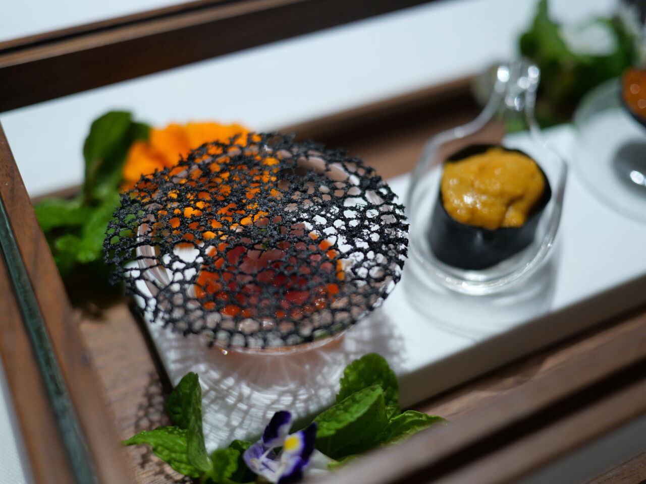 ウニの軍艦に見えますが、周りは海苔ではなく貝のペーストをパリッと焼き上げたもの!