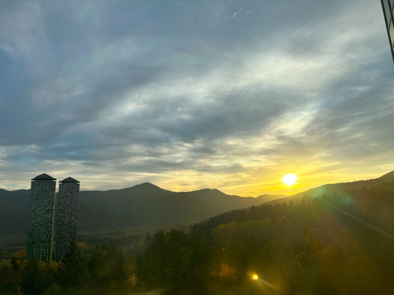 窓を除くと、沈み始めた夕日が・・・
