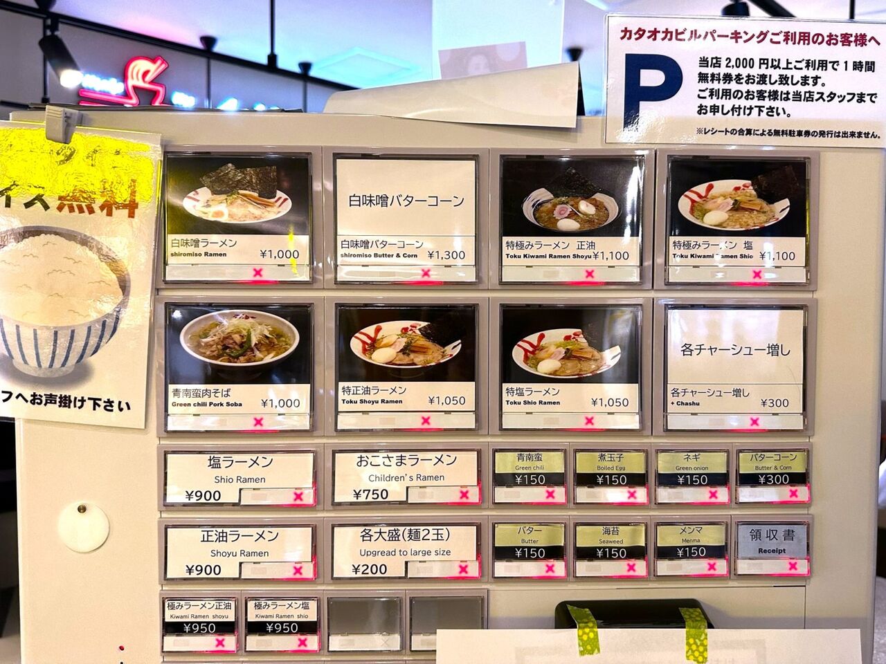 2000円以上の飲食だと、駐車料金が1時間無料になるみたいです(ただし、普通車のみ)