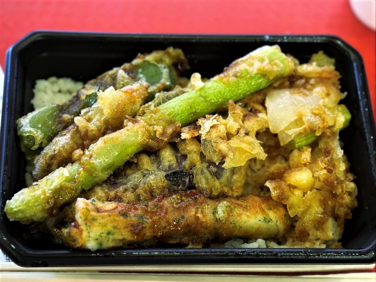 見るからに食べ応えのあるアスパラに、ちくわの磯辺揚げ、なす・ピーマン・ごぼう・玉ねぎと人参のかき揚げ