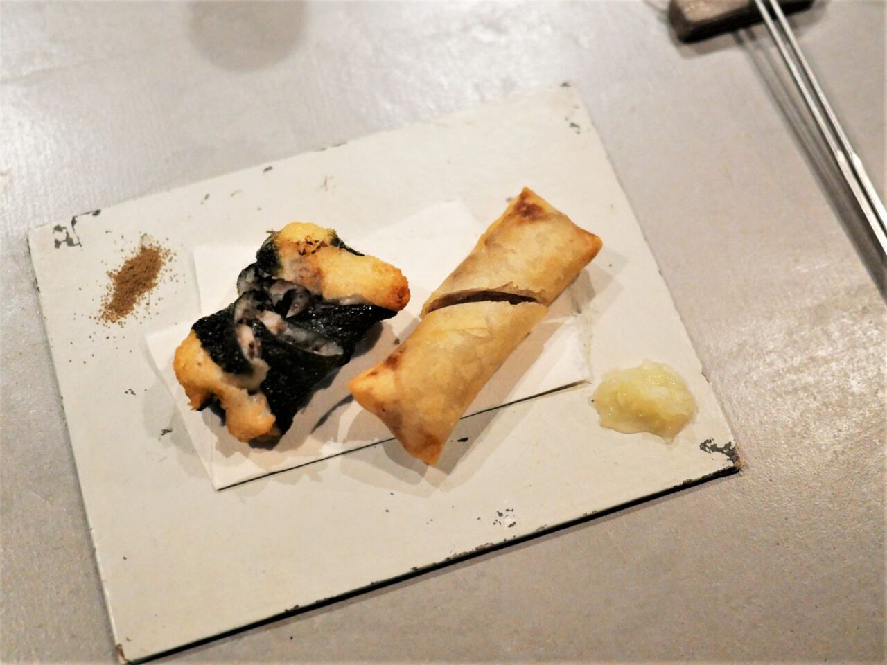 4皿目・山芋と旬魚の磯辺揚げ&春巻き