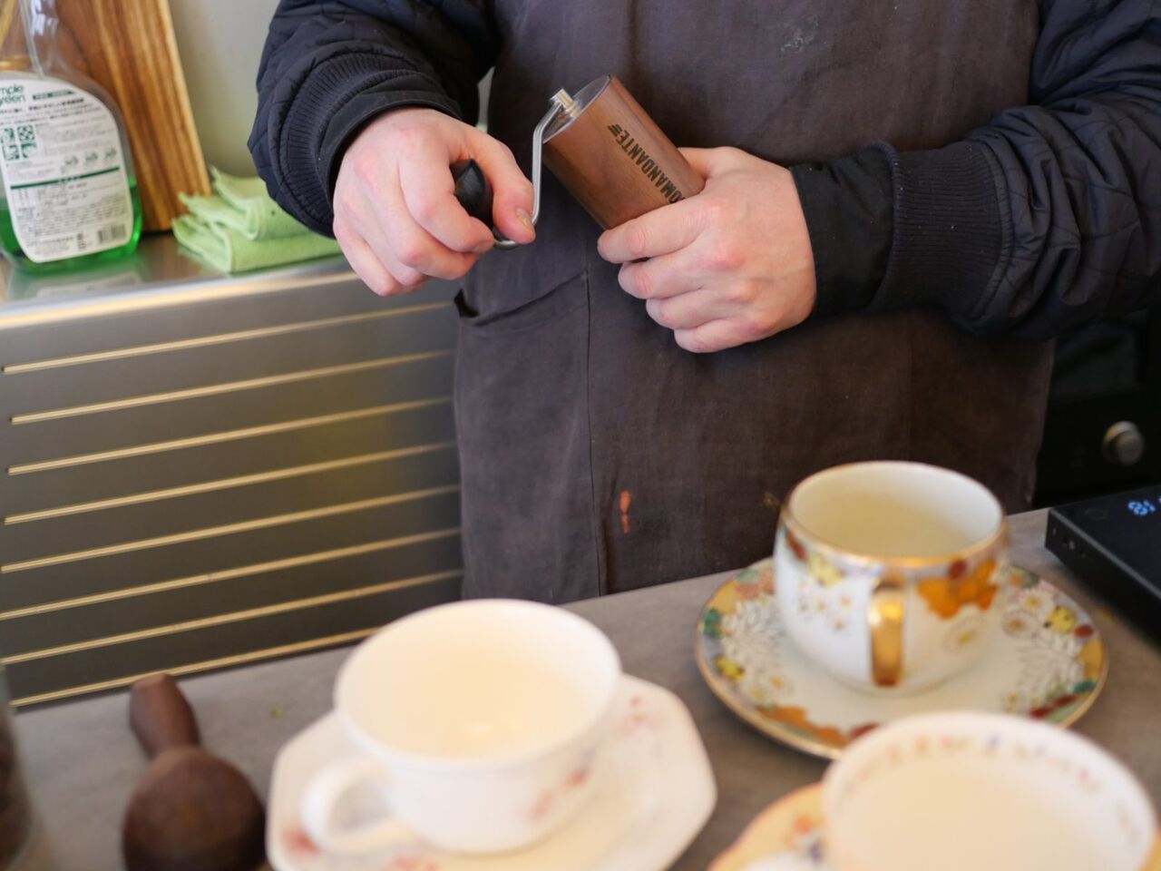 豆を挽く電動マシーンもあるのですが、小島さんはこちらのミルで豆を挽き始めました