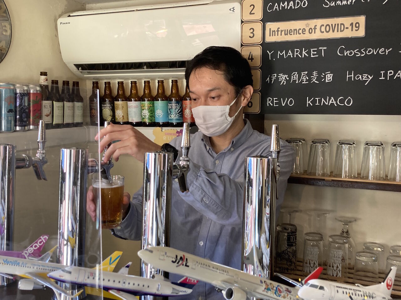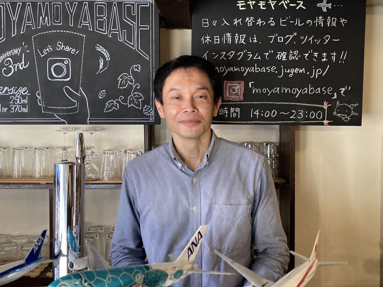 カウンターの上にズラリ飛行機の模型が並べられていて、「これはなんですか?」と聞くと「昔から飛行機が好きで…趣味なんです」と笑う。モヤモヤベースという店名が気になり、由来を聞くと「好きなテレビ番組の名前を合わせたんです」と笑う。モヤモヤさまぁ〜ずと所さんの世田谷ベースか…秋田さんはゆる〜い感じの店にしたかったんだろうか?