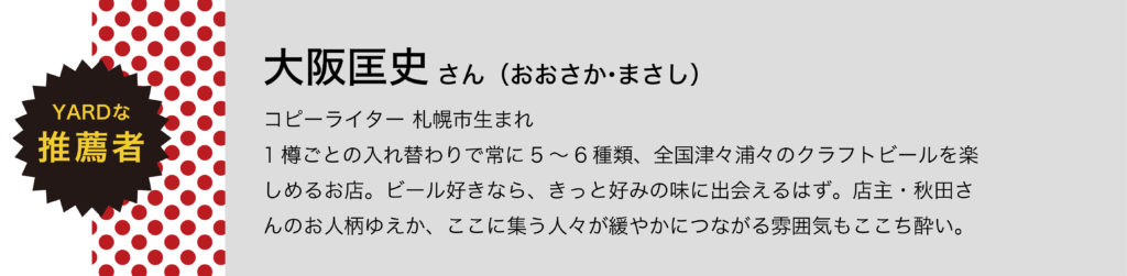 「お客さま同士が仲良くなって、和気あいあいとした感じになっているのがうれしいですね。ときにはお客さまがビールを差し入れてくれて、一緒に飲むことも。クラフトビールは味の種類が豊富で、ジュースみたいなものからウイスキーのような味もある。いろいろ飲んでみて、楽しさを見つけてほしいと思います」。和やかな店内でクラフトビールを飲みながら、誰かと出会い語り合う。モヤモヤベースで、一期一会のクラフトビールの旅を楽しもう!