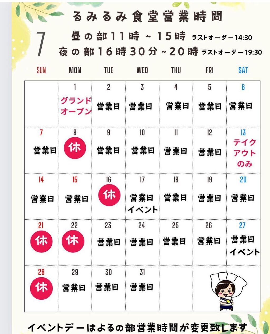 定休日:不定休 ※情報はInstagram(るみるみ食堂)でご覧ください。