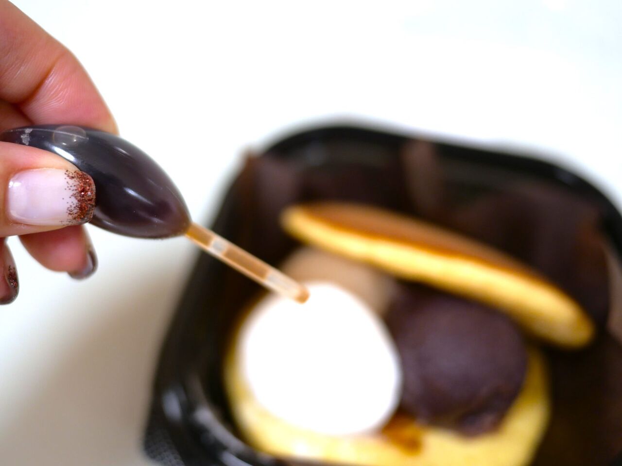 あんこに刺さっていた黒蜜をかけて完成です!