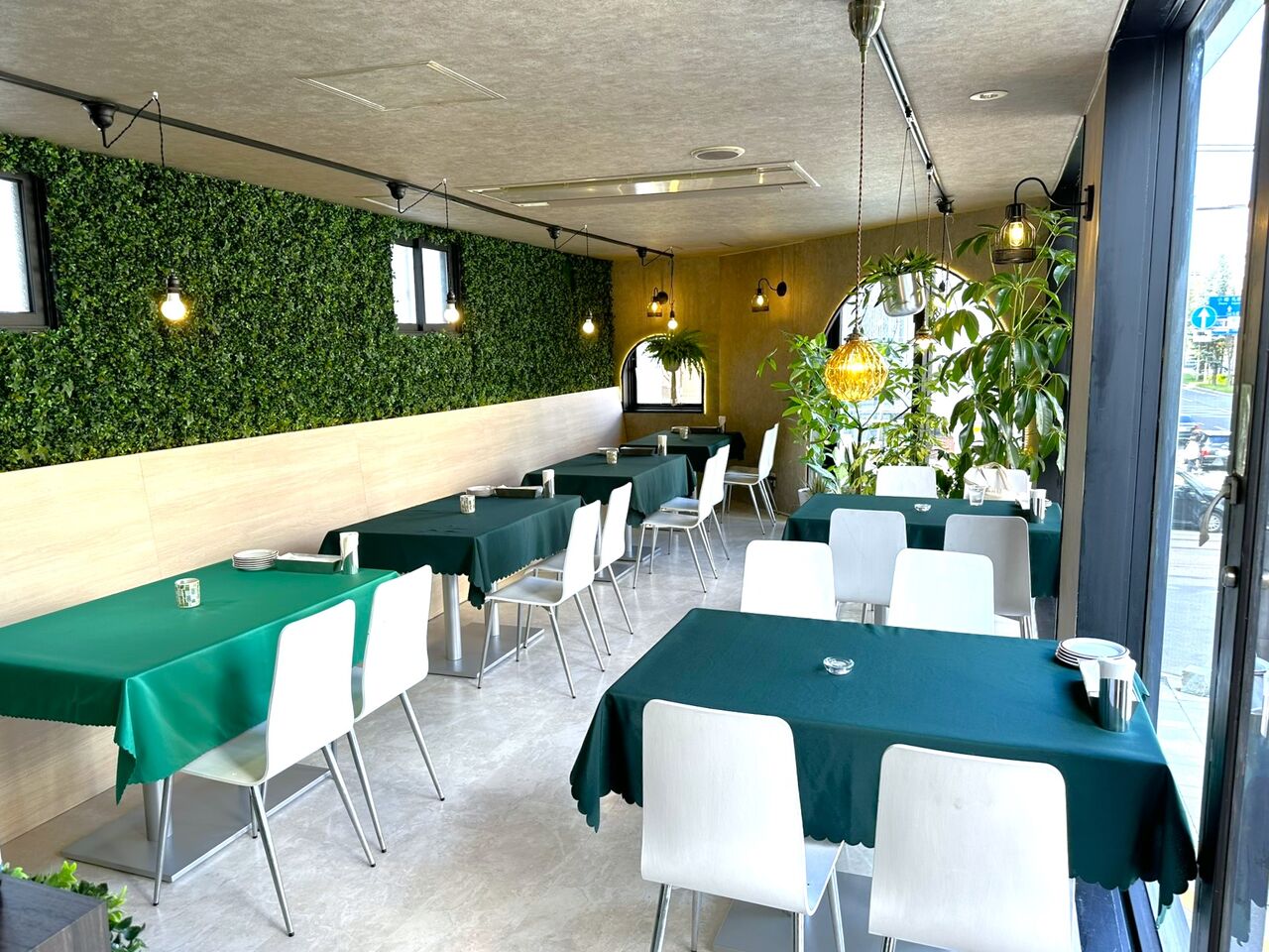 さらにテーブル席の反対側の壁が一面フェイクグリーンで、奥にはリアルグリーンが配置されていて、目に優しい(笑)