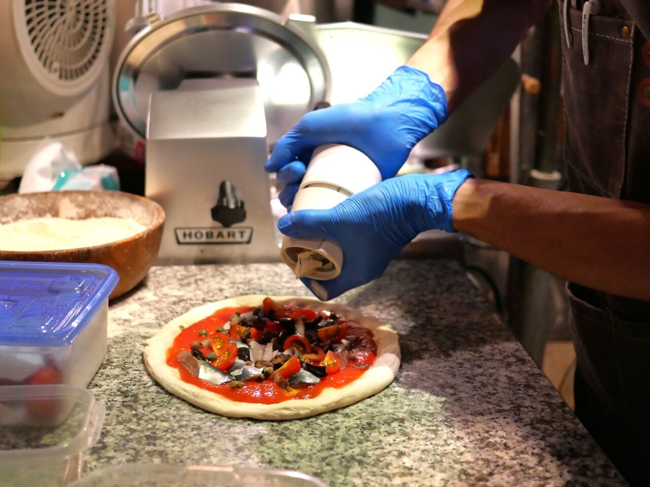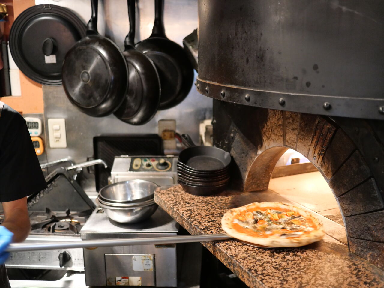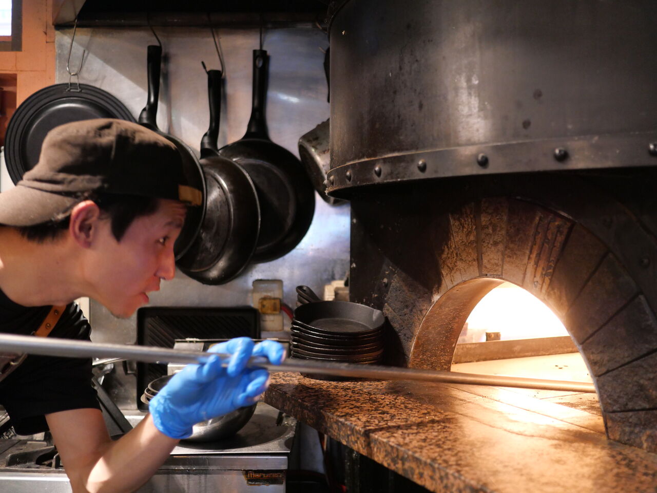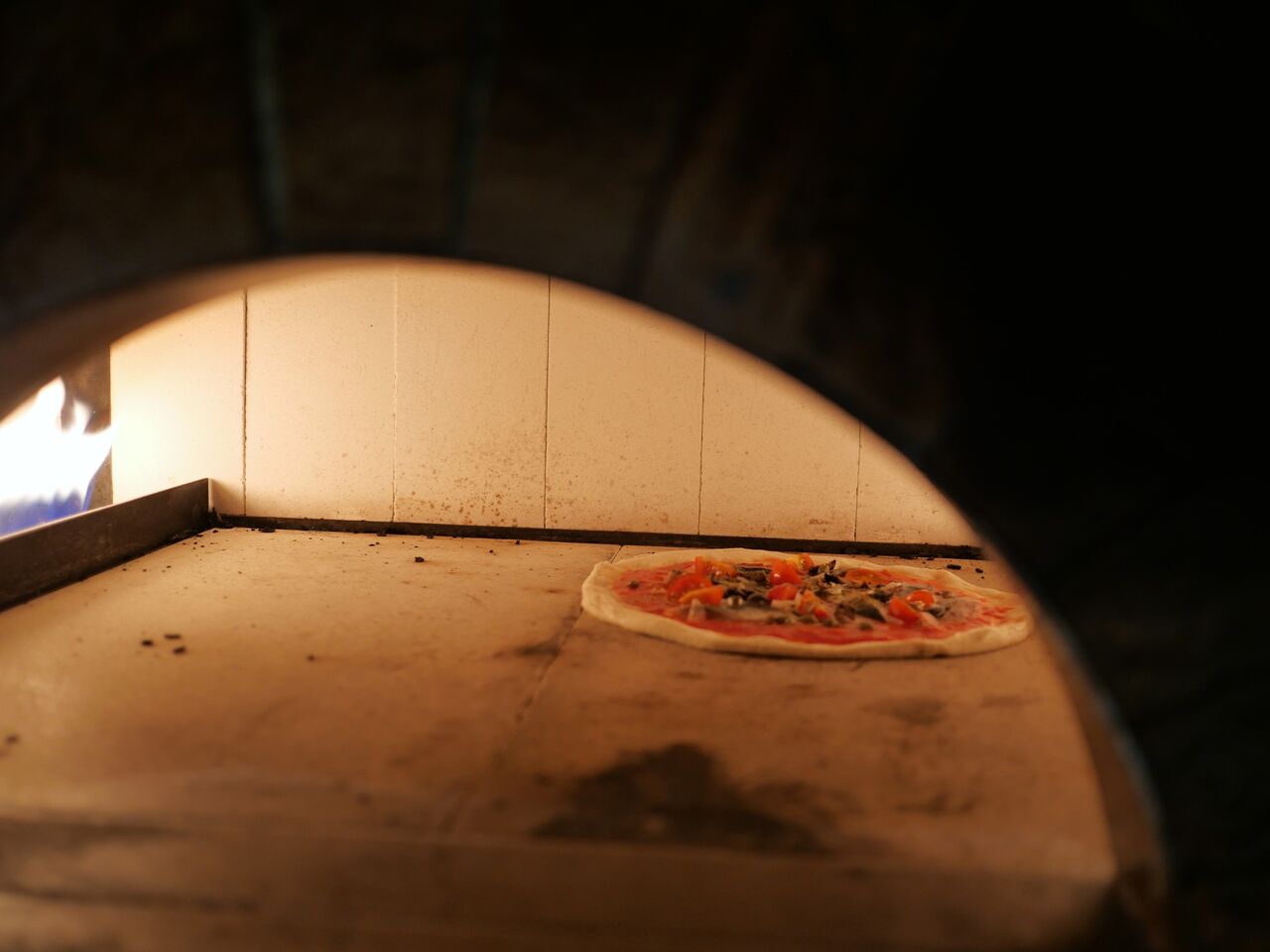 ハーブスパイスをふりかけたら、ピザ窯に入れていきます