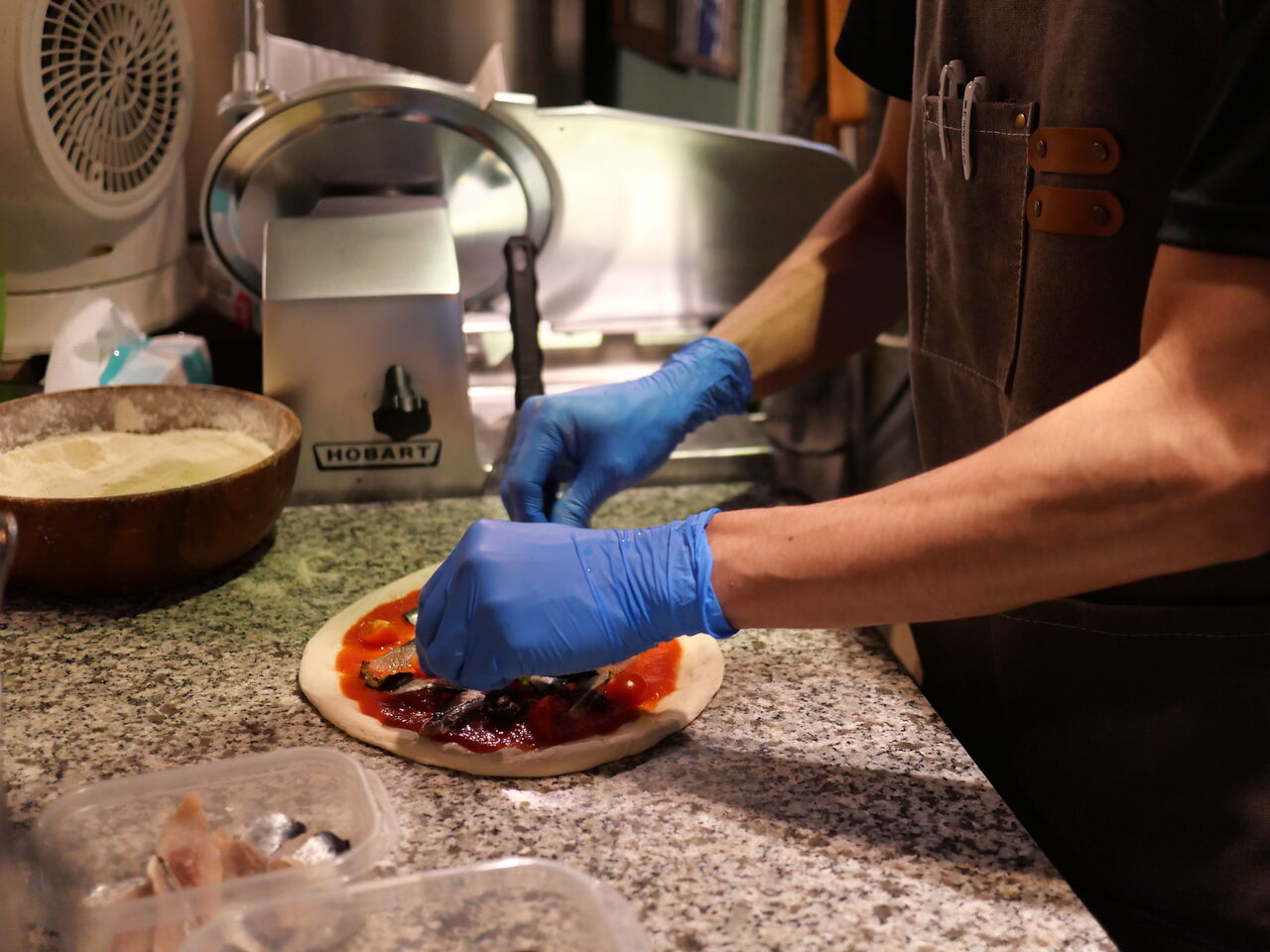 真っ赤な自家製トマトソースの上に、真いわしやオリーブ、トマトなどをのせていきます