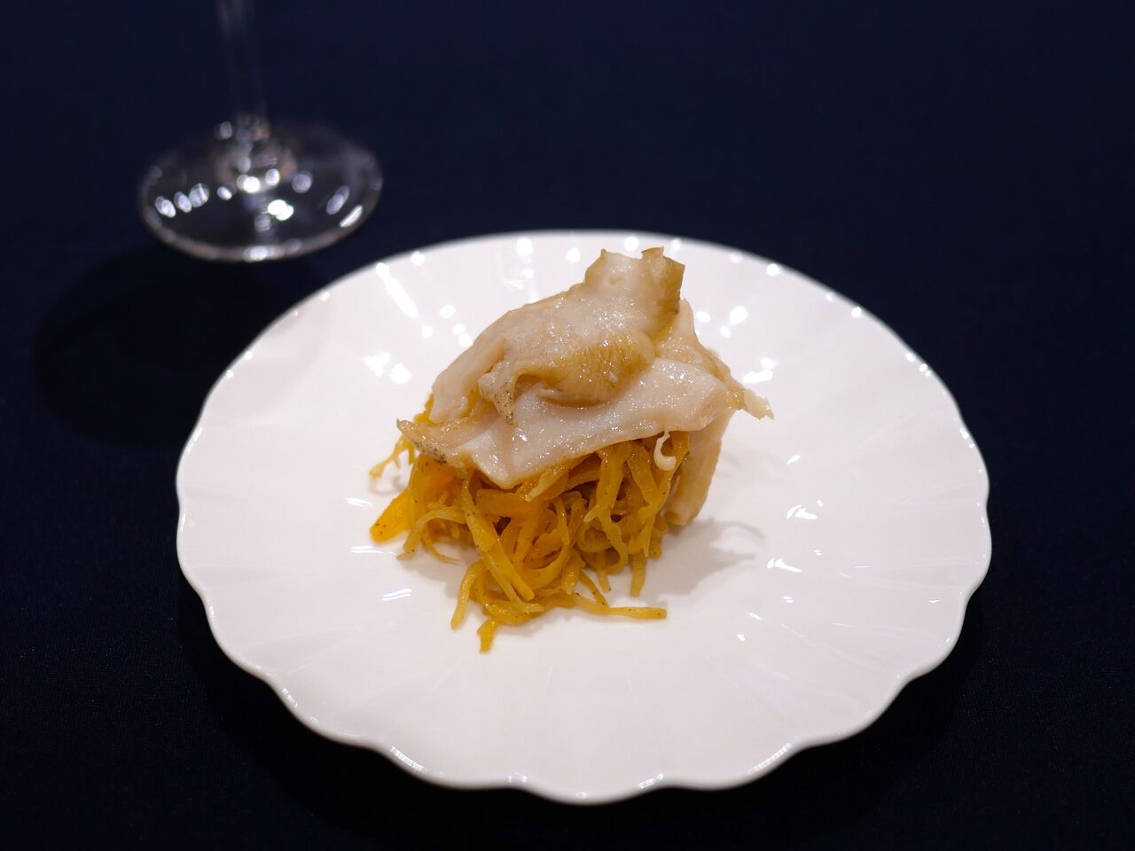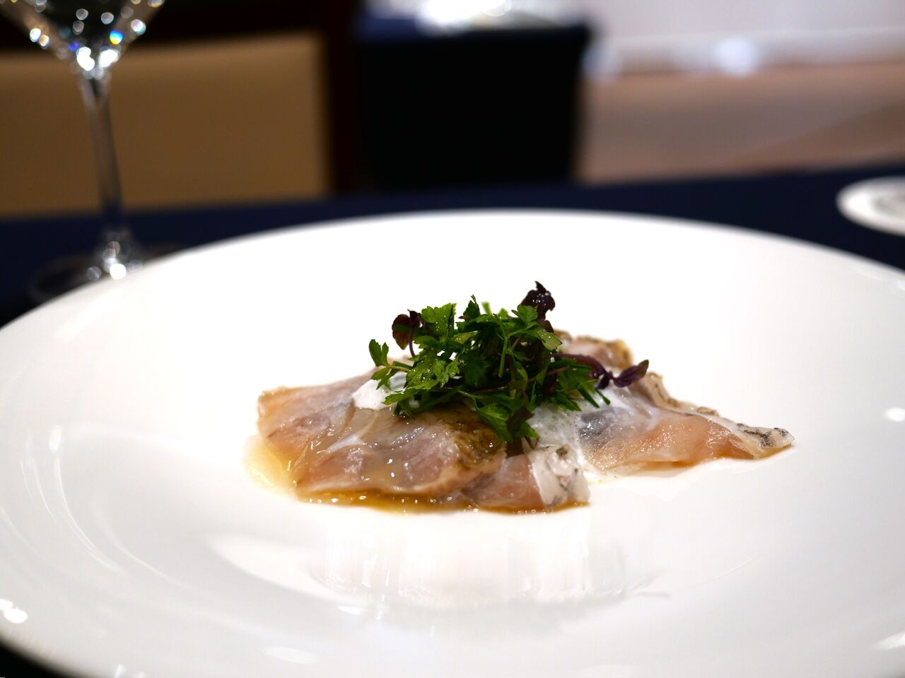 2皿目は“佐渡沖の豊かな海に育まれたのどぐろの炙りカルパッチョ 牛蒡のソース 神楽南蛮風味”
