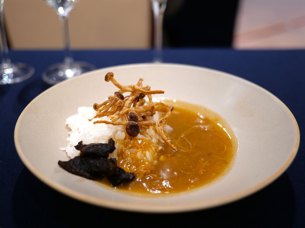なんと、かんずり(唐辛子の発酵香辛調味料)が使われていて、和な辛さが楽しめるカレーでした^0^ 上に添えられていた、乾燥きのこがまたいい塩梅