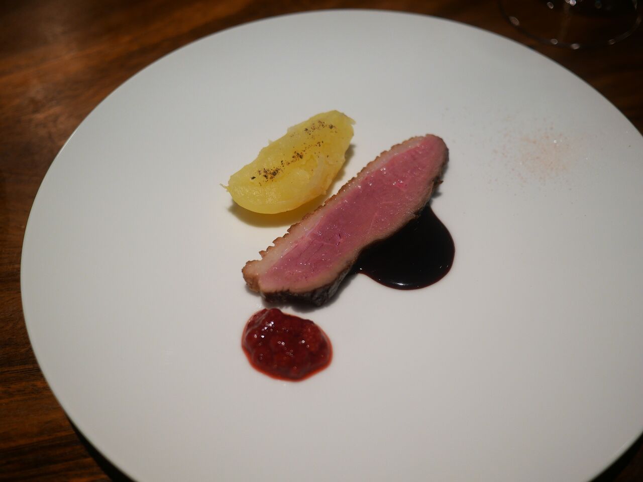 添えているベリーのソースは、シェフの自宅で穫れたワイルドストロベリーとのこと!
