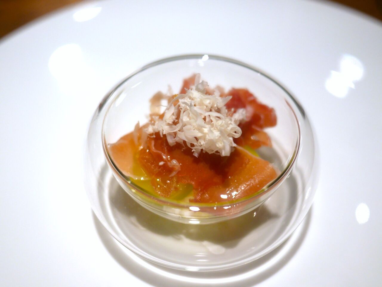 1皿目の“生ハムと果実”は、ハモンセラーノの下に余市産のシャインマスカットが隠れていました