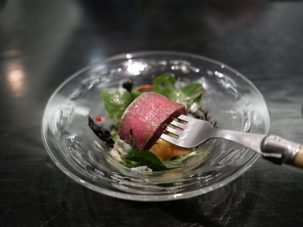 見た目はサラダっぽいけど、フォークを入れるとローストビーフのような広尾産の本マグロが!