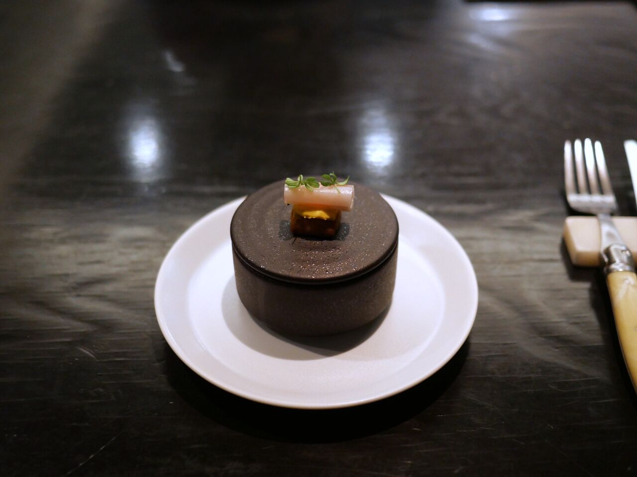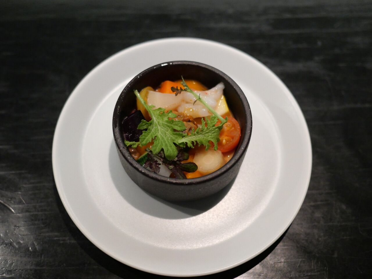 まず器の蓋の上にのっているマンガリッツアのパンチェッタとアーモンド生地を焼いたサクサク食感を楽しみ、そののちに洋風茶わん蒸しのようなとうもろこしとクレムフレという十勝産のチーズのフランとラタトゥイユ風の温野菜を堪能するスタイル