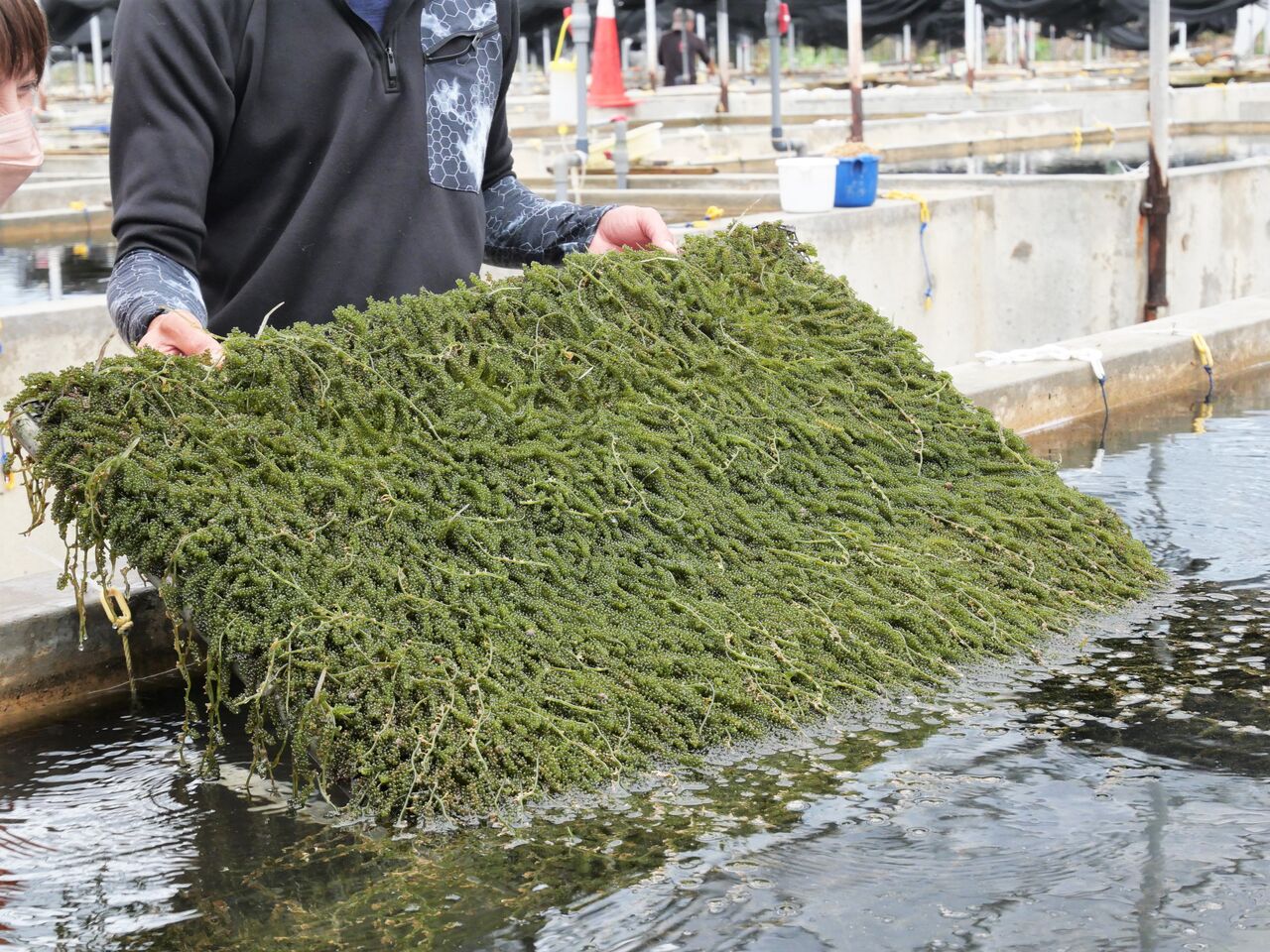 巨大な海水プールで大事に育てられている、海のグリーンキャビア・海ぶどう。寒さに弱いので冷蔵庫に入れてはいけないことを知ってましたか?