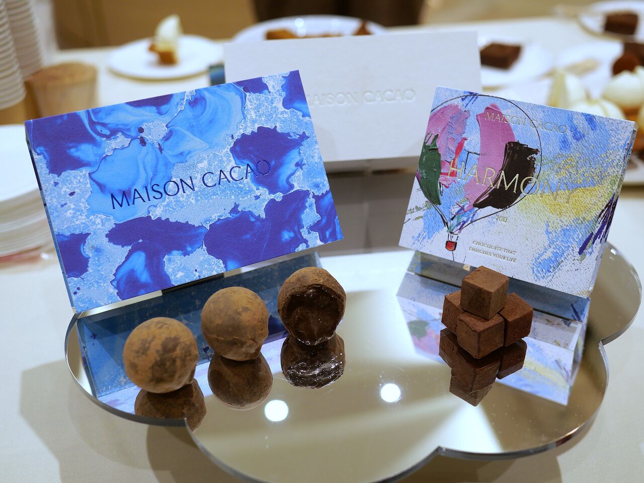 それが写真の左手の“ショコラ・コキーユ”のマスカットと、【DREAM】コレクションのアロマ生チョコレート「HARMONY」(ミックスフルーツ)