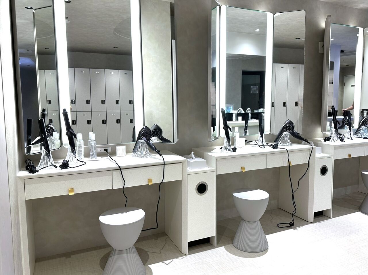 ちょうどロッカーのある方から撮影したので、ロッカーは鏡に写り込んでいるものを参照いただけるとお分かりになると思いますが、ロングタイプとセパレートタイプ、2種類あり